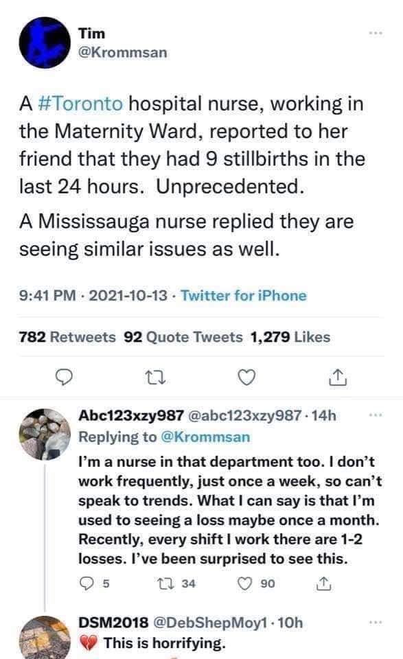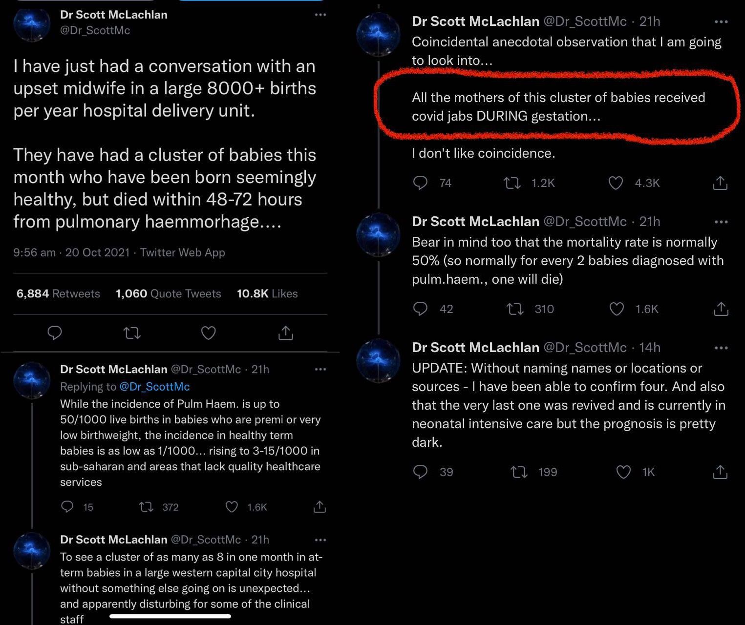 Here's an anecdotal report of 8 newborn babies in one hospital dying from pulmonary hemorrhage 2-3 days after birth. Looks like the normal incidence rate of is 1 in 1,000 with the normal death rate at 50% of cases (or 1 death from pulmonary hemorrhage every 2,000 births, a rate of 0.05%). This is a hospital that does 8,000 births per year = 7,200 non-premi = 600 per month, so they just got two years worth of pulmonary hemorrhage deaths in one month. The mothers all received jabs during gestation. Correlation is not causation, but this is exactly the kind of alarming evidence that demands pumping the brakes and performing further investigation - which sadly won't happen.
