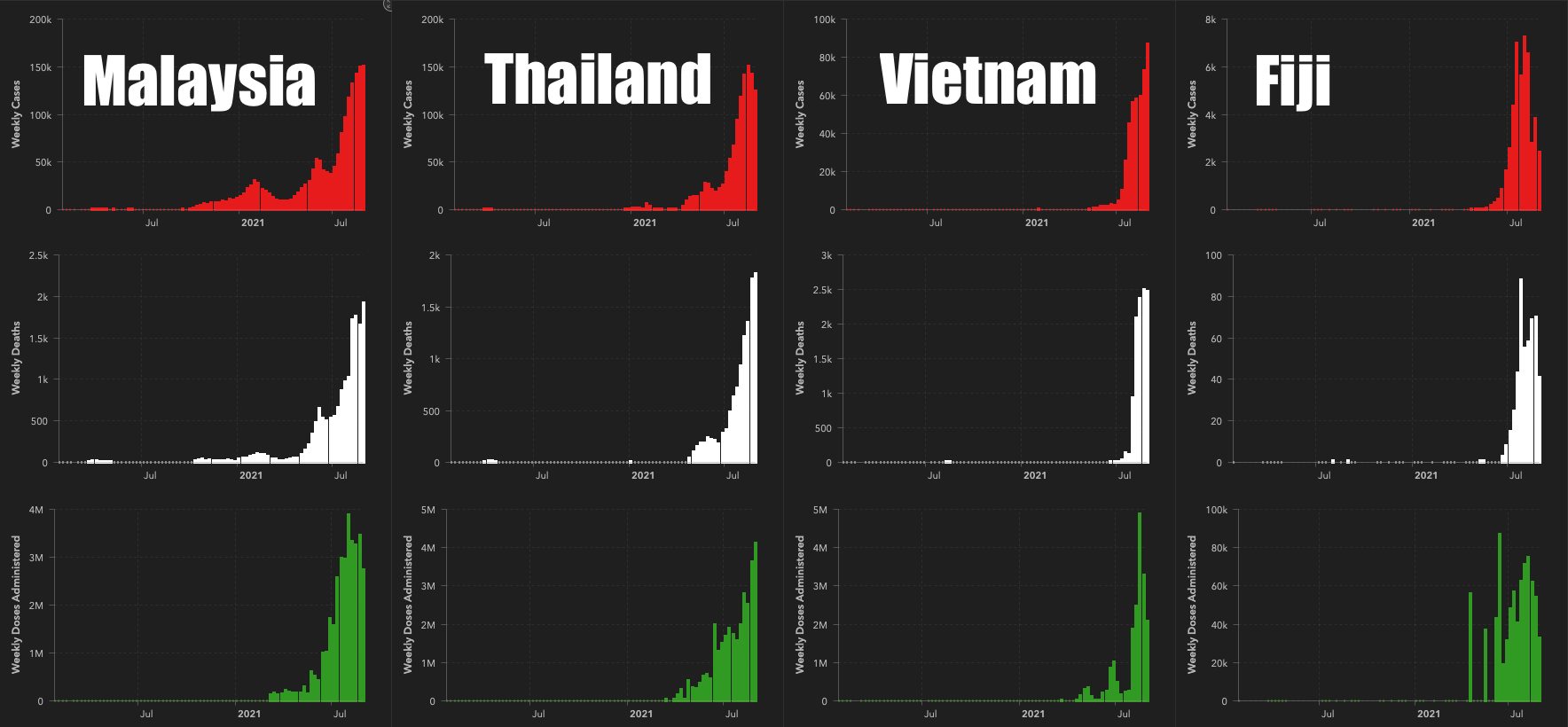 Many Asian and tropical countries such as Malaysia, Thailand, Vietnam, and Fiji had virtually no cases or deaths for a full year until they started getting vaccinated. It's my belief that the vaccine actually weakens the immune system, making people more susceptible to getting COVID and other illnesses.